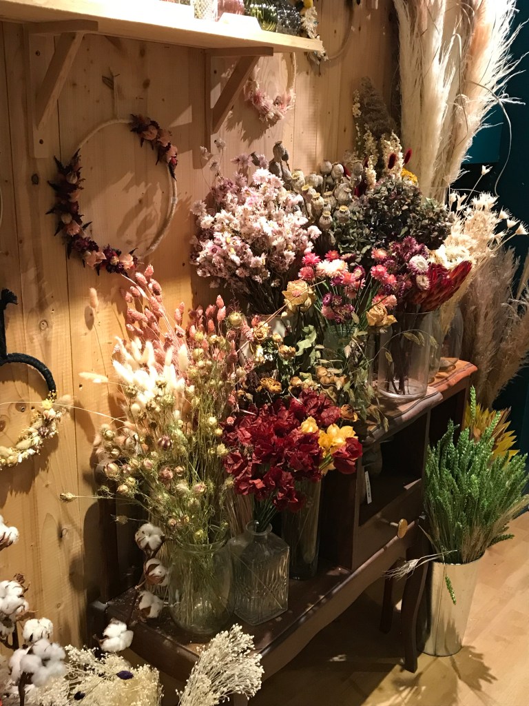 Quand aux fleurs sèches, elles ne peuvent pas toutes être séchées sur place à cause de l’humidité de la boutique alors une partie est achetée déjà sèches. Elles sont ensuite travaillées dans le magasin pour les transformer en couronnes, en compositions ou en bouquets. Il n’y a pas « d’arrière boutique » à Ronces Des Bois, tout est préparé derrière le comptoir de la caisse ! Anaëlle et Célia préparent longtemps à l’avance ces composition pour pouvoir proposer à leurs clients un large éventail de composition tout au long de l’année. Par exemple, pour les fêtes de fin d’année, elles ont commencé à préparer les fleurs début Octobre. S’assurant ainsi que vous pourrez faire vos cadeaux de Noël à l’avance.