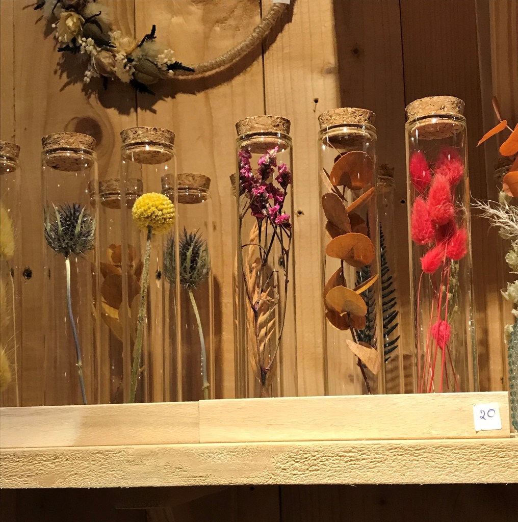 Ce qu’elles apprécient le plus dans le fait de travailler avec des fleurs séchées, c’est qu’il est tout à fait différent du travail « traditionnel » avec des fleurs fraîches. Il y a plus de possibilités (des couronnes, des bouquets, des compositions, des cadres en verre…) et les compositions tiennent beaucoup plus longtemps. Leurs dernières créations , c’est ces petites fleurs dans des tubes à essais :